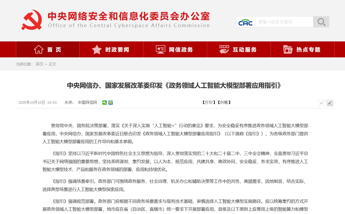 2025-10-17为深入贯彻落实党中央、国务院决策部署,规范和引导人工智能大模型在政务领域的发展与应用,提升政务数字化智能化治理和服务水平,制定本指引。本指引主要为各级政务部门提供人工智能大模...